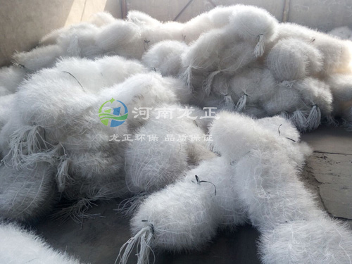 立體彈性填料篩選了聚烯烴類和聚酰胺中的幾種耐腐、耐溫、耐老化的品種,混合以親水、吸附、抗熱氧等助劑,采用特殊的拉絲,絲條制毛工藝,將絲條穿插固著在耐腐、高強度的中心繩上,由于選材和工藝配方精良,剛柔適度,使絲條呈立體均勻排列輻射狀態,制成了懸掛式立體彈性填料的單體,彈性填料在有效區域內能立體全方位均勻舒展滿布,使氣、水、生物膜得到充分混滲接觸交換,生物膜不僅能均勻的著床在每一根絲條上,保持良好的活性和空隙可變性,而且能在運行過程中獲得愈來愈大的比表面積,又能進行良好的新陳代謝。